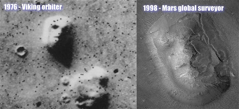 Le "Visage de Mars" vu par Viking 1 en 1976 et par Mars Global Surveyor en 1998.
