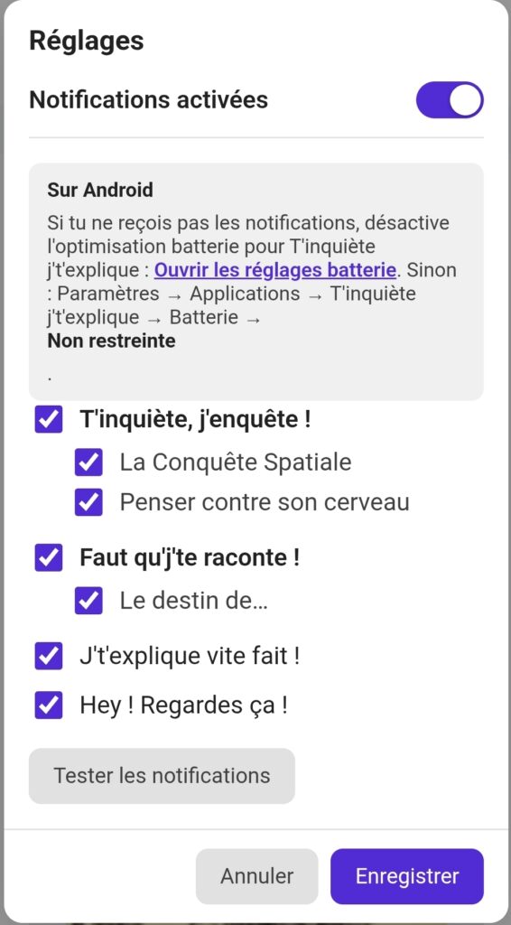 - Sur Android : si tu ne reçois pas les notifications, désactive l’optimisation batterie pour T’inquiète j’t’explique (lien ou Paramètres → Applications → T’inquiète j’t’explique → Batterie → Non restreinte).
