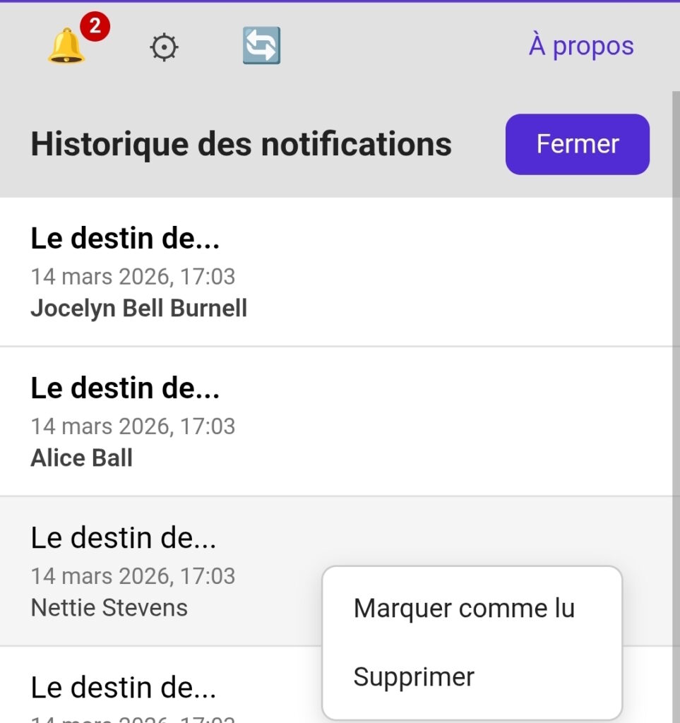 En cliquant sur la cloche (quand les notifications sont activées), l’historique s’affiche dans l’écran principal. Un clic sur une notification ouvre l’article. Appui long (mobile) ou clic droit (ordinateur) propose de « Marquer comme lu » ou « Supprimer ». L’historique est limité (50 notifications max, et chaque notification est effacée après 30 jours) et reste uniquement sur ton appareil.