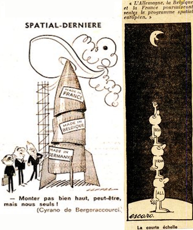 Fin 1971, après le septième échec, les fissures deviennent irrépressibles. Mais au lieu d’arrêter complètement, la France, l’Allemagne et la Belgique proposent une idée audacieuse : continuer seuls, en trois pays. Abandonner l’ELDO dans sa structure internationale rigide, mais persévérer dans le développement d’un lanceur européen. C’est une décision politique délicate. Et la presse satirique s’en est bien amusée. Des caricatures montrent l’Europe spatiale comme une construction branlante, avec les trois pays qui essaient tant bien que mal de monter un lanceur sur les débris d’Europa. Des cartoons moqueurs dans les journaux français et allemands : « Monter pas bien haut, peut-être, mais nous seuls ! » (une adaptation satirique de Cyrano de Bergerac, le héros français par excellence). L’humour de la presse tempère l’amertume des échecs. Mais derrière cette autodérision, il y a une détermination tranquille : l’Europe n’abandonne pas. Elle change juste de stratégie.